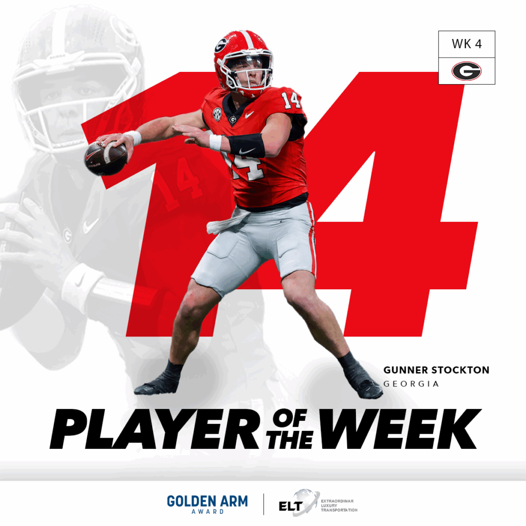 Gunner Stockton led a wild comeback against SEC rival Tennessee for an overtime 44-41 win in Knoxville. Stockton engineered comebacks throughout the game, including one of 14-points in the fourth quarter to tie the Volunteers. For the game, he completed  23 of 31 passes for two touchdowns and rushed for a third to keep the Bulldogs undefeated.